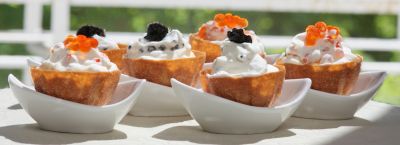 Сливки взбить, добавить мелко натертую цедру лимона и осторожно смешать с черной или красной икрой. Наполнить получившейся смесью корзиночки, украсить сверху икрой и сразу же подать на стол.