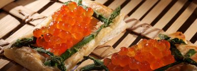 Слоеное тесто нарезать на полоски, смазать слегка взбитым яйцом, по краям выложить верхушки зеленой спаржи в виде прямоугольника и испечь в духовке (примерно 15 минут при 220°C). Остудить, острым ножом вырезать середину, ограниченную полосками спаржи и выложить в полученное углубление красную икру.