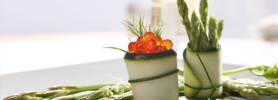 Цуккини вымыть, нарезать вдоль на очень тонкие полоски. Свернуть полоски рулетиками, наполнить красной икрой и перевязать перышком шнитт-лука. Украсить укропом.
